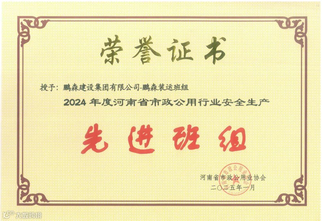 鹏森装运班组被评为2024年度河南省市政公用行业“安全生产先进班组”。