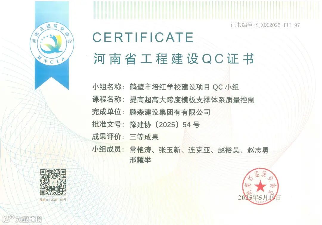 近日,在揭晓的2025 年河南省工程建设质量管理小组活动成果评价中,鹏森建设集团【鹤壁市培红学校建设项目】QC小组凭借卓越的质量管理成果和创新实践,从全省众多参赛项目中脱颖而出,荣获 “三等成果奖”!这一荣誉的获得,既是对集团质量管理工作的高度认可,更是集团持续提升工程品质的动力源泉!