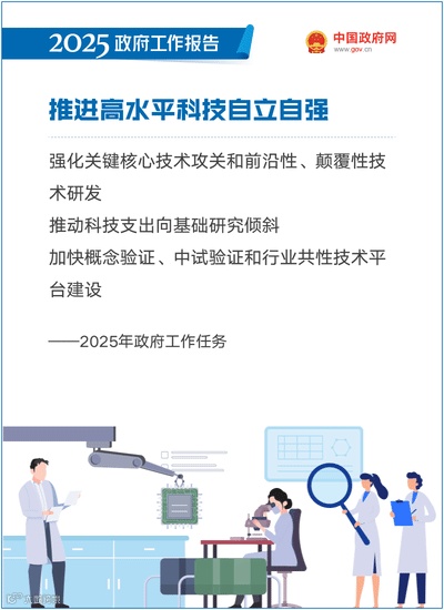 推进高水平科技自立自强。充分发挥新型举国体制优势,强化关键核心技术攻关和前沿性、颠覆性技术研发,加快组织实施和超前布局重大科技项目。优化国家战略科技力量布局,推进科研院所改革,探索国家实验室新型科研组织模式,增强国际和区域科技创新中心辐射带动能力。推动科技支出向基础研究倾斜,完善竞争性支持和稳定支持相结合的投入机制,提高基础研究组织化程度。发挥科技领军企业龙头作用,加强企业主导的产学研深度融合,从制度上保障企业参与国家科技创新决策、承担重大科技项目。完善中央财政科技经费分配和管理使用机制。健全科技成果转化支持政策和市场服务,推进职务科技成果赋权和资产单列管理改革,提升科技成果转化效能。加强知识产权保护和运用。加快概念验证、中试验证和行业共性技术平台建设。健全创投基金差异化监管制度,强化政策性金融支持,加快发展创业投资、壮大耐心资本。扩大科技开放合作。加强科学普及工作,提升公民科学素质。弘扬科学家精神,推动形成鼓励探索、宽容失败的创新环境。