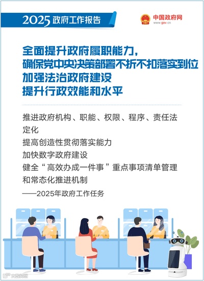 提升行政效能和水平。坚持求真务实,从实际出发解决问题。善于把党中央决策部署与自身实际结合起来,谋划牵引性、撬动性强的工作抓手和载体,提高创造性贯彻落实能力。加快数字政府建设,健全“高效办成一件事”重点事项清单管理和常态化推进机制,完善覆盖全国的一体化在线政务服务平台。强化正向激励,完善考核评价体系,持续整治形式主义为基层减负,切实把面向基层的多头重复、指标细碎、方式繁琐的督查检查考核减下来,让广大干部把更多时间和精力用到干实事上。各级政府工作人员要坚持干字当头、脚踏实地,创造更多经得起历史和人民检验的发展业绩。