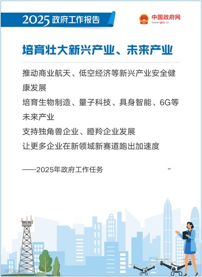 培育壮大新兴产业、未来产业。深入推进战略性新兴产业融合集群发展。开展新技术新产品新场景大规模应用示范行动,推动商业航天、低空经济等新兴产业安全健康发展。建立未来产业投入增长机制,培育生物制造、量子科技、具身智能、6G等未来产业。深化先进制造业和现代服务业融合发展试点,加快发展服务型制造。加强产业统筹布局和产能监测预警,促进产业有序发展和良性竞争。加快国家高新区创新发展。梯度培育创新型企业,促进专精特新中小企业发展壮大,支持独角兽企业、瞪羚企业发展,让更多企业在新领域新赛道跑出加速度。