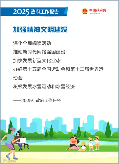 加强精神文明建设。完善培育和践行社会主义核心价值观制度机制,推进群众性精神文明创建和公民道德建设。发展哲学社会科学、新闻出版、广播影视、文学艺术和档案等事业,加强智库建设。深化全民阅读活动。加强和改进未成年人思想道德建设。健全网络生态治理长效机制,发展积极健康的网络文化,推动新时代网络强国建设。完善公共文化服务体系,推动优质文化资源直达基层。健全文化产业体系和市场体系,加快发展新型文化业态。推进文化遗产系统性保护,提升文物、非物质文化遗产保护利用和考古研究水平。扩大国际人文交流合作,全面提升国际传播效能。改革完善竞技体育管理体制和运行机制。办好第十五届全国运动会和第十二届世界运动会。积极发展冰雪运动和冰雪经济。推进群众身边的运动场地设施建设,广泛开展全民健身活动。加强青少年科学健身普及和健康干预,让年轻一代在运动中强意志、健身心。