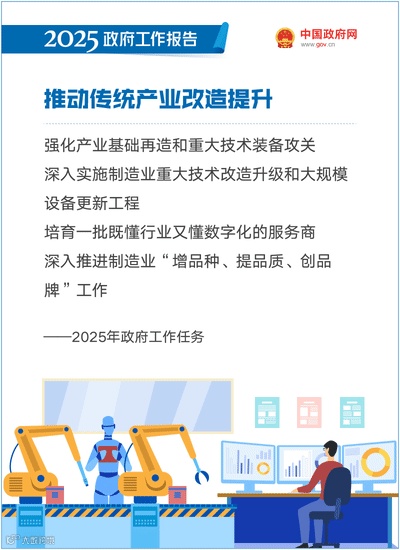 推动传统产业改造提升。加快制造业重点产业链高质量发展,强化产业基础再造和重大技术装备攻关。进一步扩范围、降门槛,深入实施制造业重大技术改造升级和大规模设备更新工程。加快制造业数字化转型,培育一批既懂行业又懂数字化的服务商,加大对中小企业数字化转型的支持。开展标准提升引领传统产业优化升级行动。深入推进制造业“增品种、提品质、创品牌”工作,加强全面质量管理,打造名品精品、经典产业。