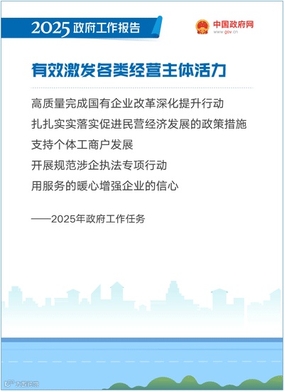 有效激发各类经营主体活力。坚持和落实“两个毫不动摇”。高质量完成国有企业改革深化提升行动,实施国有经济布局优化和结构调整指引,加快建立国有企业履行战略使命评价制度。扎扎实实落实促进民营经济发展的政策措施,切实依法保护民营企业和民营企业家合法权益,鼓励有条件的民营企业建立完善中国特色现代企业制度。加力推进清理拖欠企业账款工作,强化源头治理和失信惩戒,落实解决拖欠企业账款问题长效机制。深化政企常态化沟通交流,切实帮助企业解决实际困难和问题。支持个体工商户发展。开展规范涉企执法专项行动,集中整治乱收费、乱罚款、乱检查、乱查封,坚决防止违规异地执法和趋利性执法。政府要寓管理于服务之中,用服务的暖心增强企业的信心。