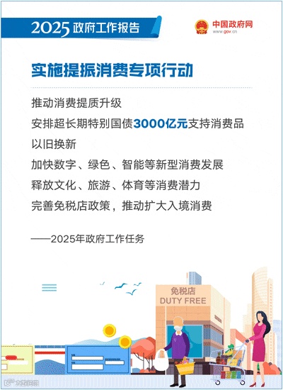 实施提振消费专项行动。制定提升消费能力、增加优质供给、改善消费环境专项措施,释放多样化、差异化消费潜力,推动消费提质升级。多渠道促进居民增收,推动中低收入群体增收减负,完善劳动者工资正常增长机制。安排超长期特别国债3000亿元支持消费品以旧换新。从放宽准入、减少限制、优化监管等方面入手,扩大健康、养老、托幼、家政等多元化服务供给。创新和丰富消费场景,加快数字、绿色、智能等新型消费发展。落实和优化休假制度,释放文化、旅游、体育等消费潜力。完善免税店政策,推动扩大入境消费。深化国际消费中心城市建设,健全县域商业体系。完善全口径消费统计制度。强化消费者权益保护,营造安全放心消费环境。