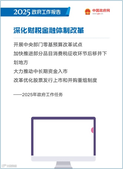 深化财税金融体制改革。开展中央部门零基预算改革试点,支持地方深化零基预算改革,在支出标准、绩效评价等关键制度上积极创新。加快推进部分品目消费税征收环节后移并下划地方,增加地方自主财力。规范税收优惠政策。积极探索建立激励机制,促进地方在高质量发展中培育财源。严控财政供养人员规模。完善科技金融、绿色金融、普惠金融、养老金融、数字金融标准体系和基础制度。深化资本市场投融资综合改革,大力推动中长期资金入市,加强战略性力量储备和稳市机制建设。改革优化股票发行上市和并购重组制度。加快多层次债券市场发展。
