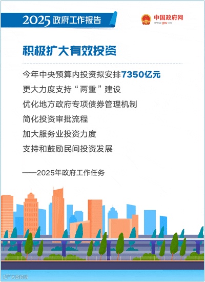 积极扩大有效投资。紧扣国家发展战略和民生需求,发挥好各类政府投资工具作用,加强财政与金融配合,强化项目储备和要素保障,加快实施一批重点项目,推动“十四五”规划重大工程顺利收官。切实选准选好项目,管好用好资金,保障在建项目资金需求,坚决防止低效无效投资。今年中央预算内投资拟安排7350亿元。用好超长期特别国债,强化超长期贷款等配套融资,加强自上而下组织协调,更大力度支持“两重”建设。优化地方政府专项债券管理机制,实施好投向领域负面清单管理、下放项目审核权限等措施。简化投资审批流程,建立健全跨部门跨区域重大项目协调推进机制。加大服务业投资力度。支持和鼓励民间投资发展,规范实施政府和社会资本合作新机制,引导更多民间资本参与重大基础设施、社会民生等领域建设,让民间资本有更大发展空间。