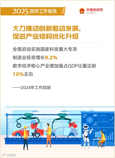 三是大力推动创新驱动发展,促进产业结构优化升级。推进科技强国建设,全面启动实施国家科技重大专项,加快完善重大科技基础设施体系,加强拔尖创新人才培养。稳定工业经济运行,推进制造业技术改造升级,制造业投资增长9.2%。新培育一批国家级先进制造业集群,商业航天、北斗应用、新型储能等新兴产业快速发展。制定修订环保、安全等强制性国家标准。加快数字中国建设,数字经济核心产业增加值占国内生产总值比重达到10%左右。