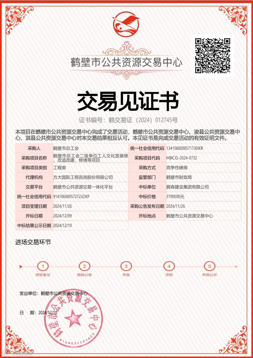 鹏森建设集团在鹤壁市总工会二级单位工人文化宫装修、改造改建、修缮等项目竞标中,凭借完善的资质,良好的市场信誉,成熟的技术方案,以及合理的报价在竞争对手中脱颖而出,成功中标! 中标价379万元。