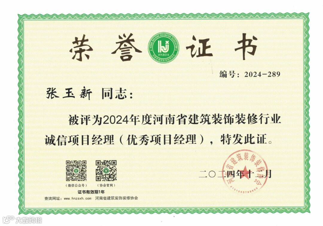 张玉新被评为“诚信项目经理(优秀项目经理)”。