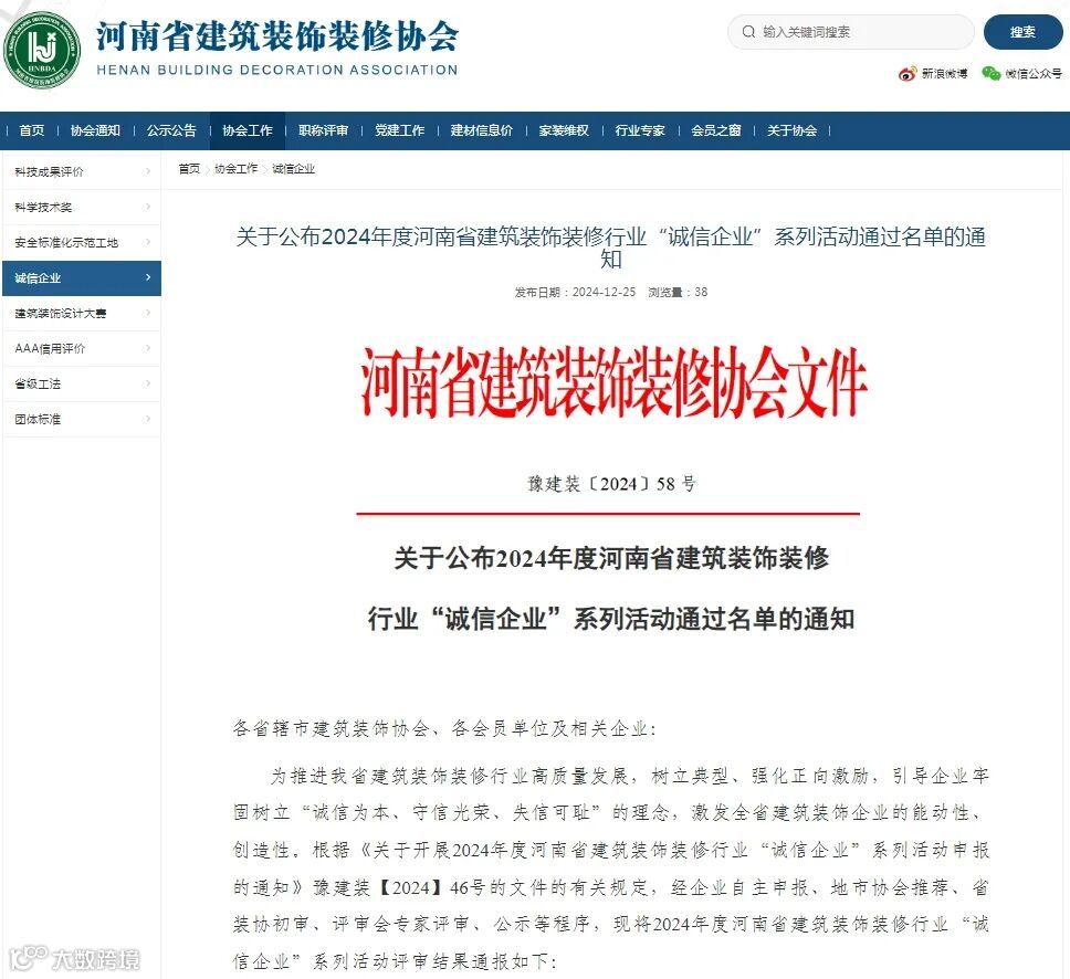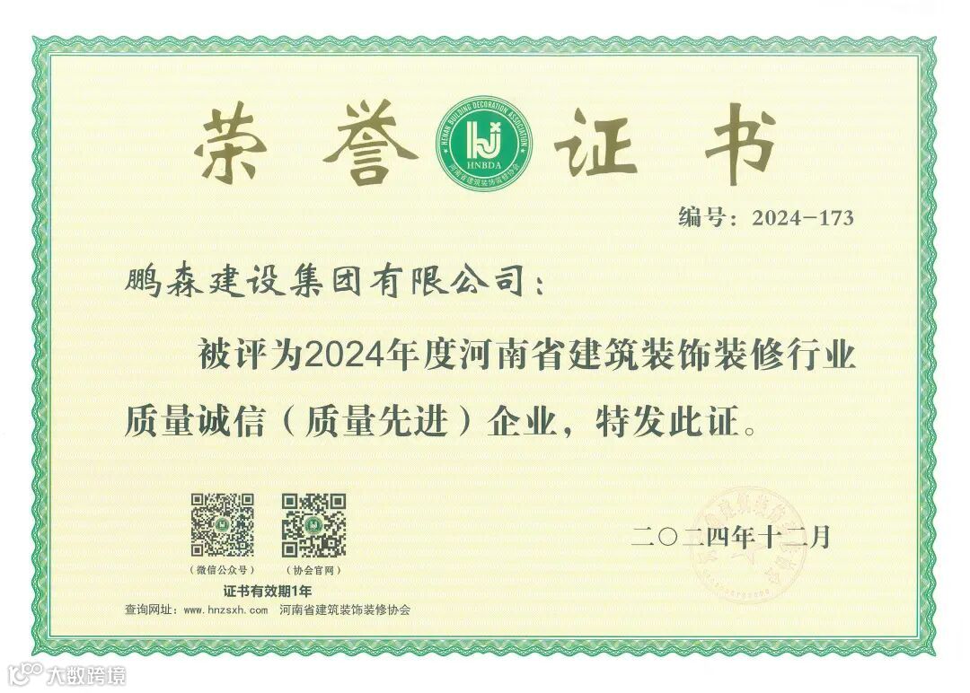据悉,鹏森建设集团在河南省建筑装饰装修协会公布的2024年度第二批河南省建筑装饰装修行业“诚信企业”系列活动中喜获多项荣誉。