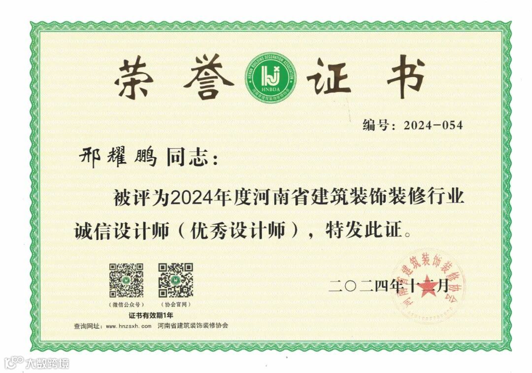 董事长邢耀鹏被评为“诚信企业家(优秀企业家)”、“诚信设计师(优秀设计师)”。