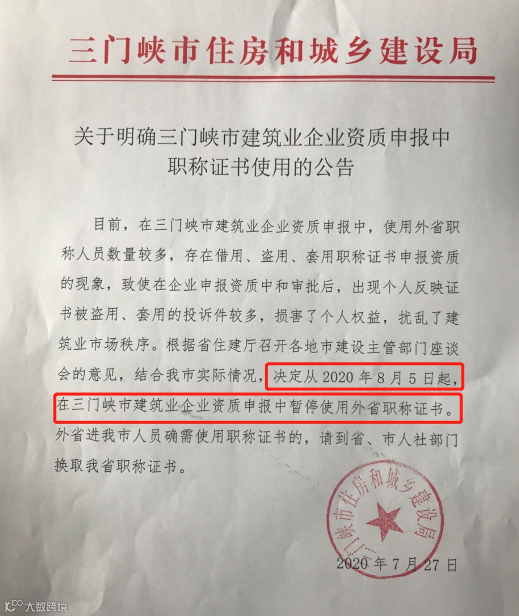 为进一步保护个人权益,规范建筑业市场秩序,更好的服务建筑业高质量发展。经研究决定,从2023年9月1日起,在鹤壁市(县、区)建筑业企业资质首次申报中暂停使用外省职称证书;从2023年10月1日起,在建筑业企业资质增项、升级申报中暂停使用外省职称证书。外省进鹤人员确需使用职称证书的,请按照《职称评审管理暂行规定》(人社部令第40号)等文件精神,到省、市人社部门换取我省职称证书后使用。
