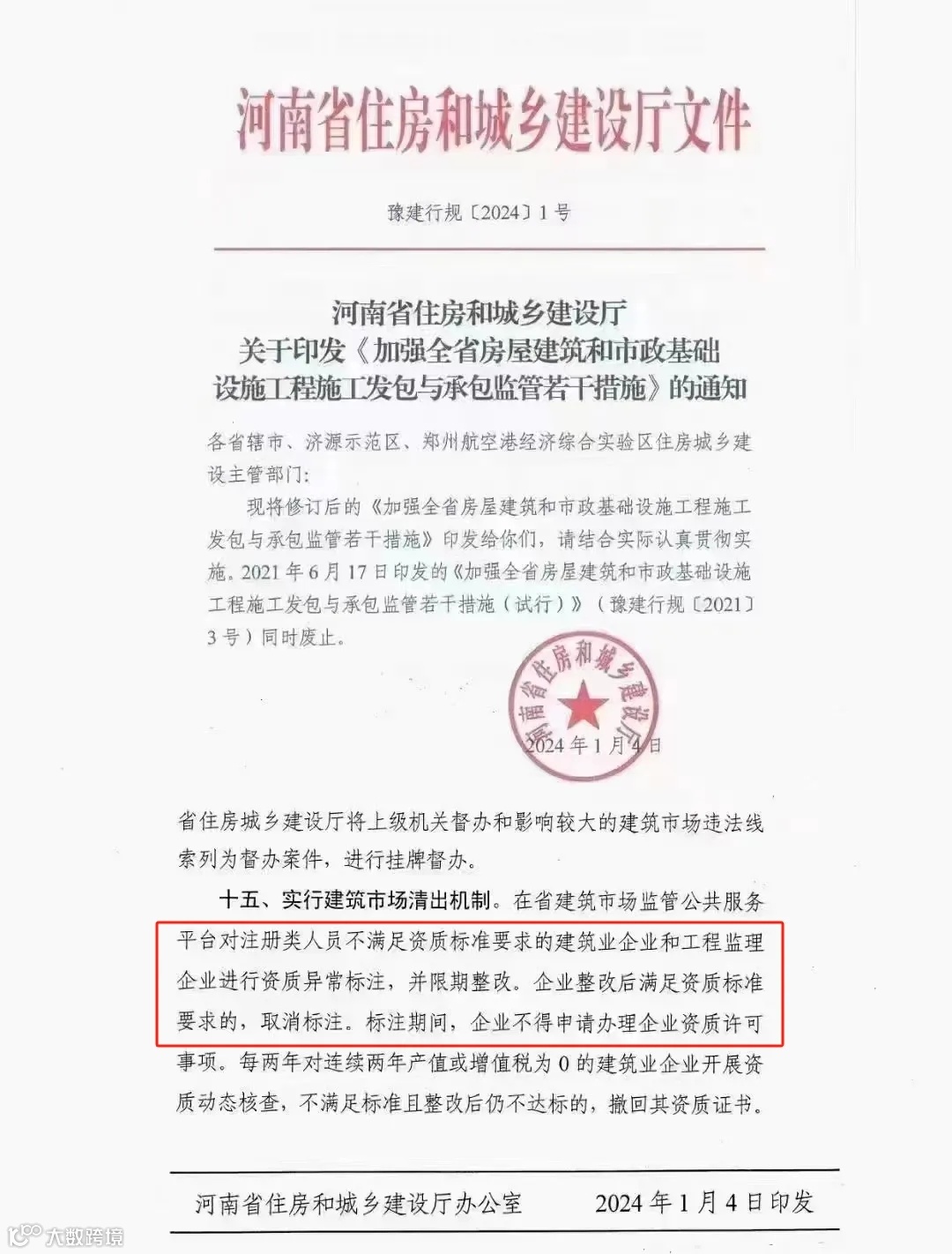 根据省住建厅关于对近期河南省建筑市场监管公共服务平台(以下简称“省监管平台”)数据筛查中发现的注册人员异常及注册人员不足企业处理有关要求,及近期资质评审中发现的借用、盗用、套用职称证书申报资质乱象问题,现通知如下: