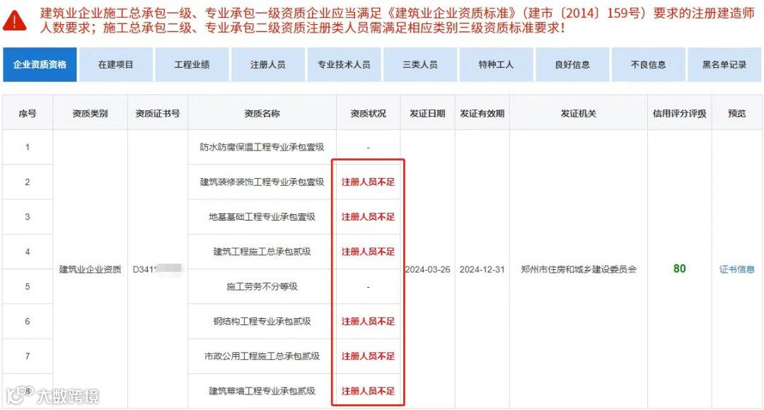 1.依据《加强全省房屋建筑和市政基础工程施工发包与承包监管若干措施》(豫建行规〔2024〕1号)相关要求,凡是被省监管平台标注“注册人员异常”或“注册人员不足”的企业应当立即整改。标注期间,企业不得申请办理资质许可事项(包括:增项、升级、变更、合并、重组、分立等)。整改到位后,省监管平台自动取消异常标注,企业方可申请办理行政许可。