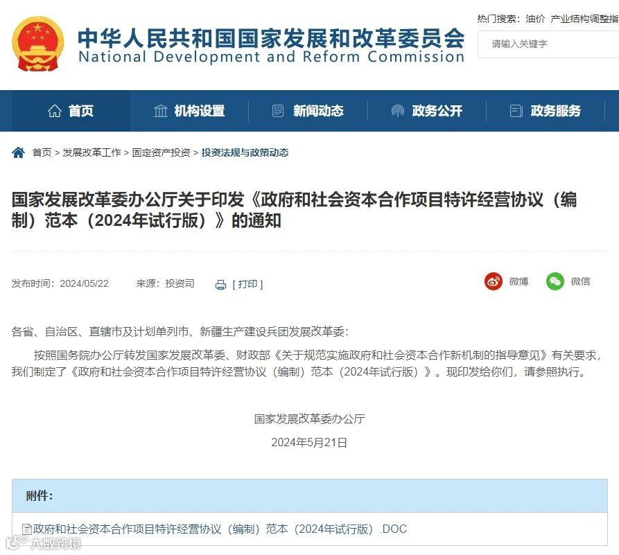 国家发展改革委办公厅印发《政府和社会资本合作项目特许经营协议(编制)范本(2024年试行版)》