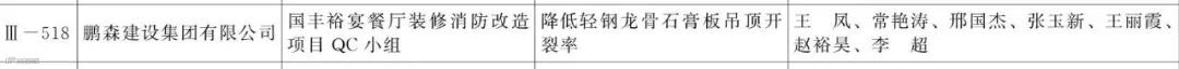 鹏森建设集团有限公司国丰裕宴餐厅装修消防改造项目QC小组发布的课题《降低轻钢龙骨石膏板吊顶开裂率》荣获三等成果奖。