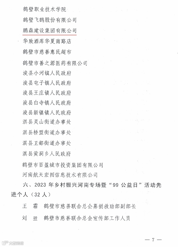 鹏森建设集团有限公司荣评“2023年乡村振兴河南专场暨‘99公益日’活动爱心单位”。