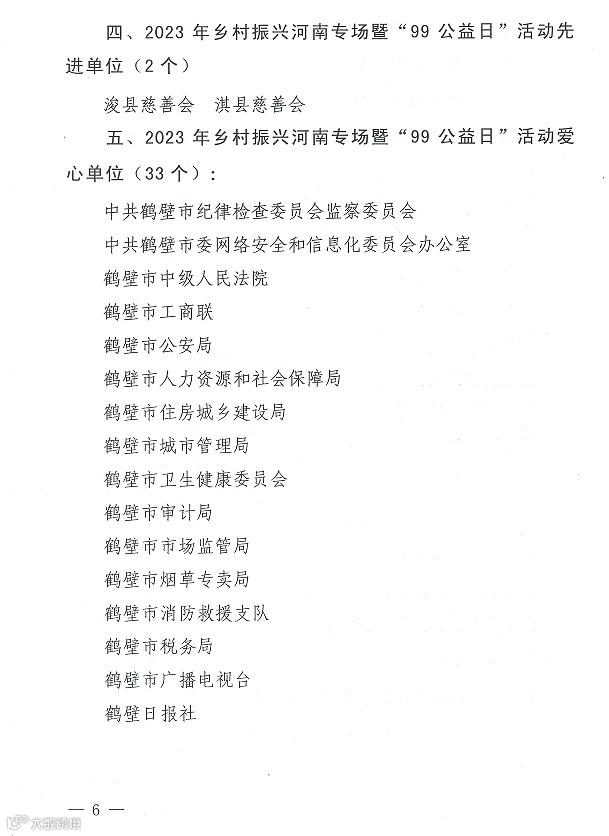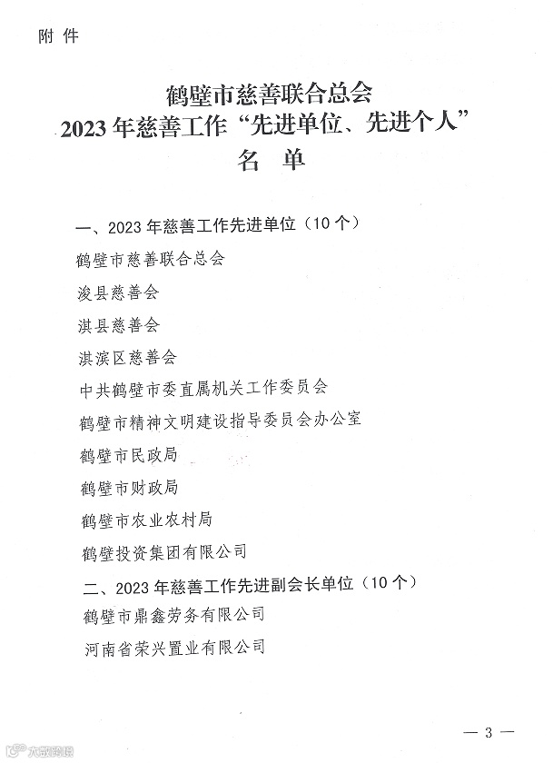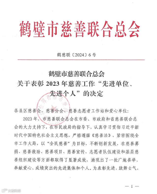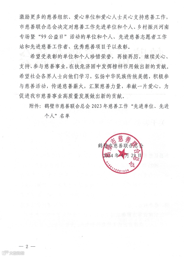 4月29日,鹤壁市慈善联合总会2023年度慈善工作表彰大会举行,大会公布了我市2023年慈善工作“先进单位、先进个人”。