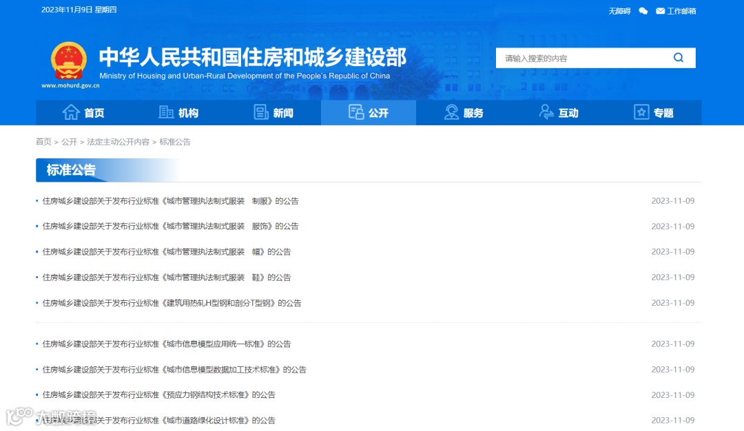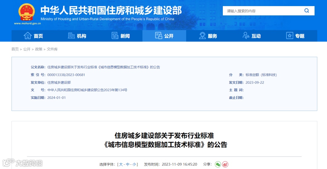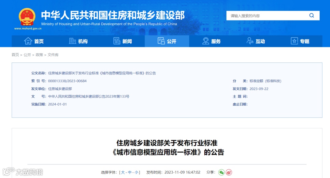 现批准《城市信息模型应用统一标准》为行业标准,编号为CJJ/T318-2023,自2024年1月1日起实施。