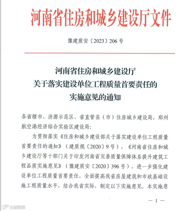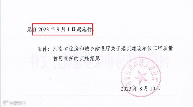 近日,河南省住建厅发布《关于落实建设单位工程质量首要责任的实施意见的通知》,自9月1日起实施。