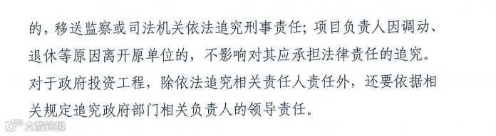 建设单位存在工程质量违法违规行为的,依法予以查处,并追究有关责任人员的责任,涉嫌犯罪的,移送监察或司法机关依法追究刑事责任;项目负责人因调动、退休等原因离开原单位的,不影响对其应承担法律责任的追究。