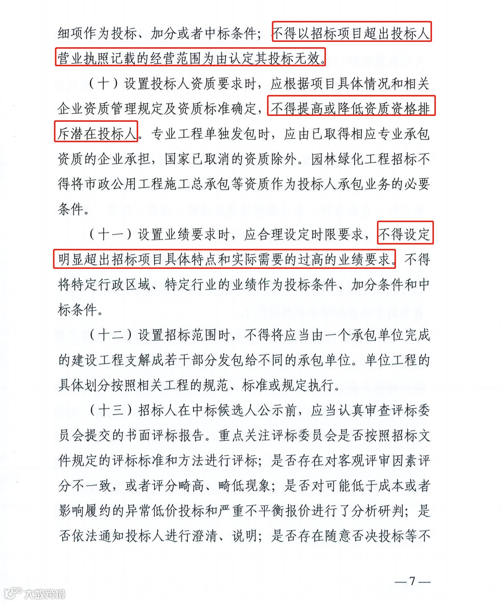 不得限制或者排斥潜在投标人,以及对潜在投标人实行歧视待遇;不得以营业执照记载的经营范围作为确定投标人经营资质资格的依据;不得将投标人营业执照记载的经营范围采用某种特定表述或者明确记载某个特定经营范围细项作为投标、加分或者中标条件;不得以招标项目超出投标人营业执照记载的经营范围为由认定其投标无效。