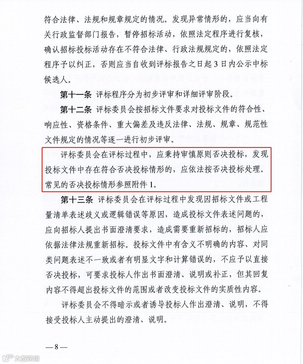 第十二条 评标委员会在评标过程中,应秉持审慎原则否决投标,发现投标文件中存在符合否决投标情形的,应依法按否决投标处理。