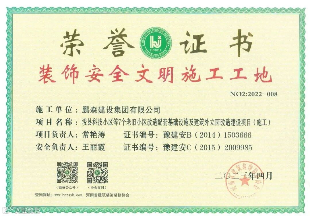 【热烈庆祝】鹏森建设集团有限公司浚县科技小区等7个老旧小区改造配套基础设施及建筑外立面改造建设项目荣获“2022年度第二批河南省建筑装饰安全文明施工工地”的荣誉称号。