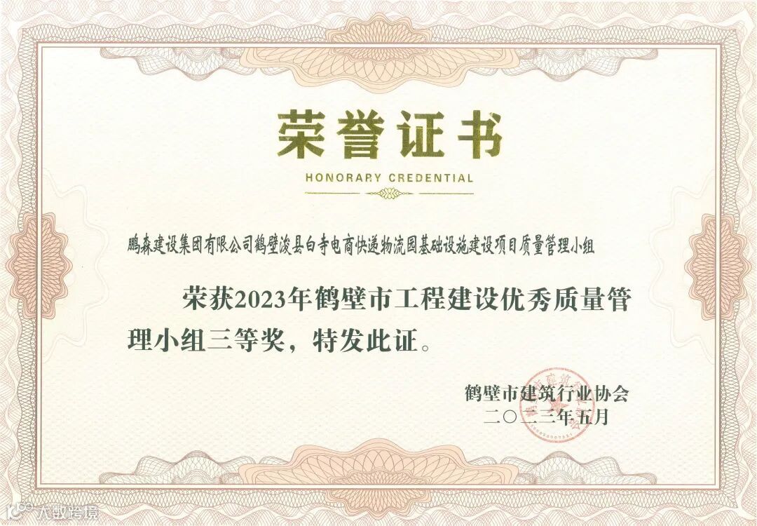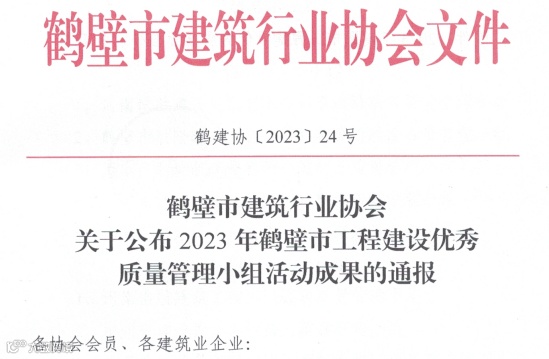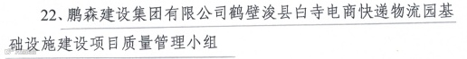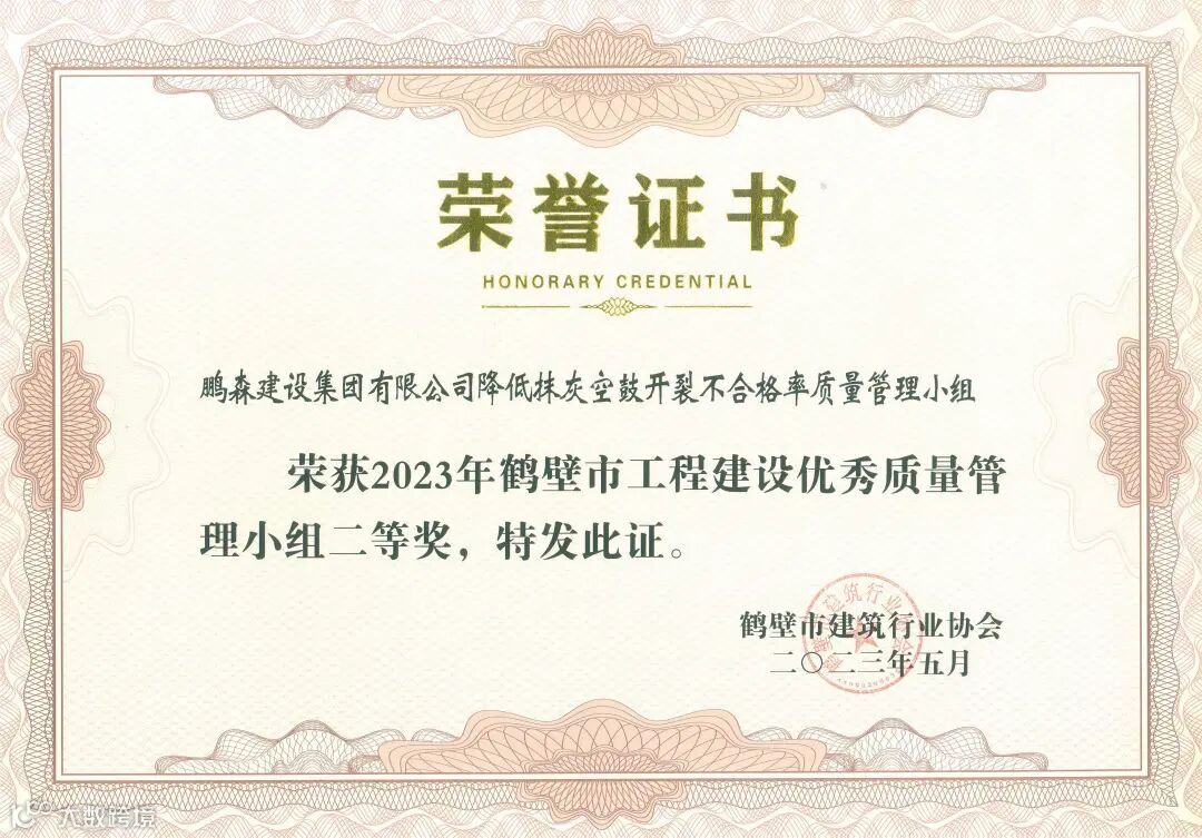 近日,鹏森建设集团有限公司降低抹灰空鼓开裂不合格率QC小组、鹤壁浚县白寺电商快递物流园基础设施建设项目QC小组分别在鹤壁市建筑业协会发布的2023年鹤壁市工程建设质量管理小组活动成果评价结果中荣获二等奖、三等奖。