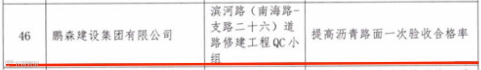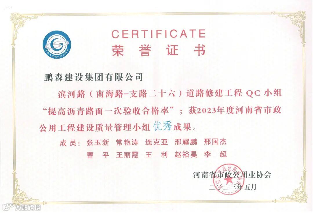 河南省市政公用业协会发布了2023年度河南省市政公用工程建设优秀质量管理小组等评选结果,鹏森建设集团有限公司承建的滨河路(南海路-支路二十六)道路修建工程QC小组“提高沥青路面一次验收合格率”荣获2023年度河南省市政公用工程建设质量管理小组优秀成果。
