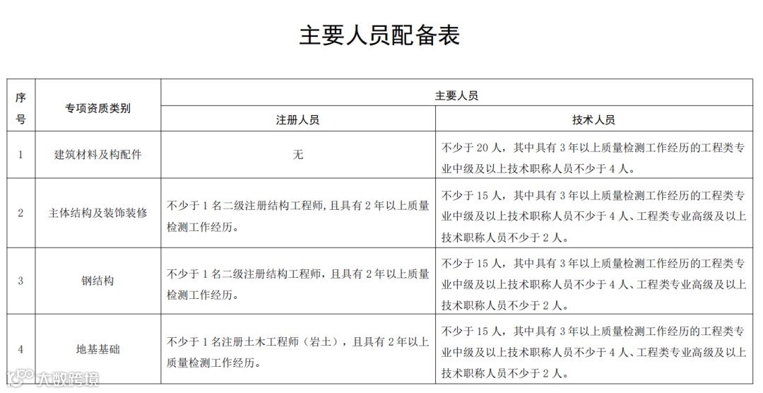 4、对于无检测机构的偏远县(市、区),登记地址在本县(市、区)的申请人申请检测机构资质时,经省级住房和城乡建设主管部门同意,可以适当降低其申请专项资质中主要人员数量标准,但建筑材料及构配件、建筑节能、市政工程材料3个专项资质,技术人员不少于15人,其中工程类专业中级及以上技术职称人员不少于3人;主体结构及装饰装修、钢结构、地基基础、建筑幕墙、道路工程、桥梁及地下工程6个专项资质,技术人员不少于12人,其中工程类专业中级及以上技术职称人员不少于3人,工程类专业高级及以上技术职称人员不少于1人。