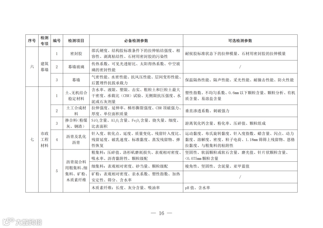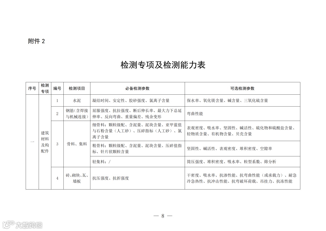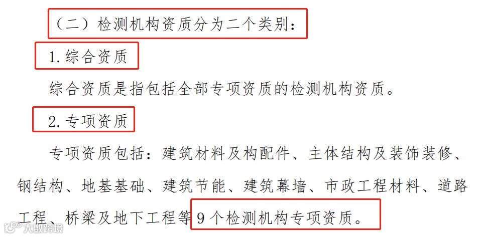 1、将检测资质分为综合资质和专项资质,其中专项资质分为建筑材料及构配件、主体结构及装饰装修、钢结构、地基基础、建筑节能、建筑幕墙、市政工程材料、道路工程、桥梁及地下工程9个专项资质,更好地满足建设工程质量检测实际需要。