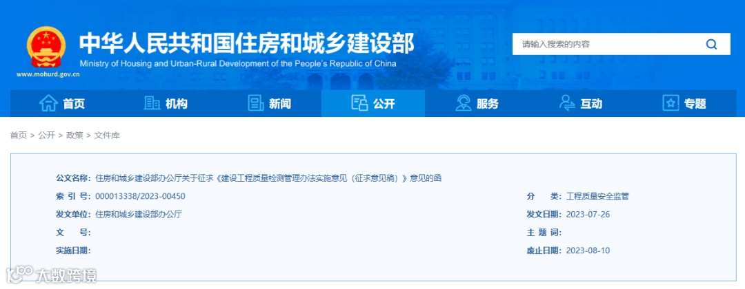 为贯彻落实《建设工程质量检测管理办法》(住房和城乡建设部令第57号)和《建设工程质量检测机构资质标准》(建质规〔2023〕1号),加强建设工程质量检测管理,推动建设工程质量检测行业健康有序发展,我部研究起草了《建设工程质量检测管理办法实施意见(征求意见稿)》(见附件),现向社会公开征求意见。有关单位或个人可于2023年8月10日前通过以下途径和方式提出反馈意见: