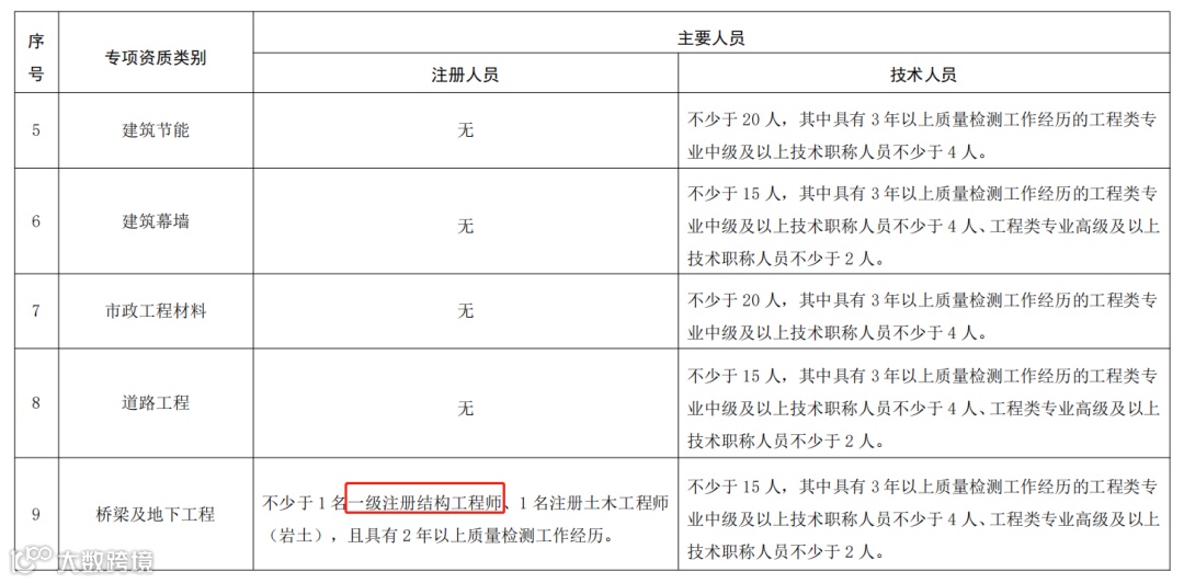 主体结构及装饰装修、钢结构、地基基础、建筑幕墙、道路工程、桥梁及地下工程等6项专项资质,应当具有3年以上质量检测经历 |