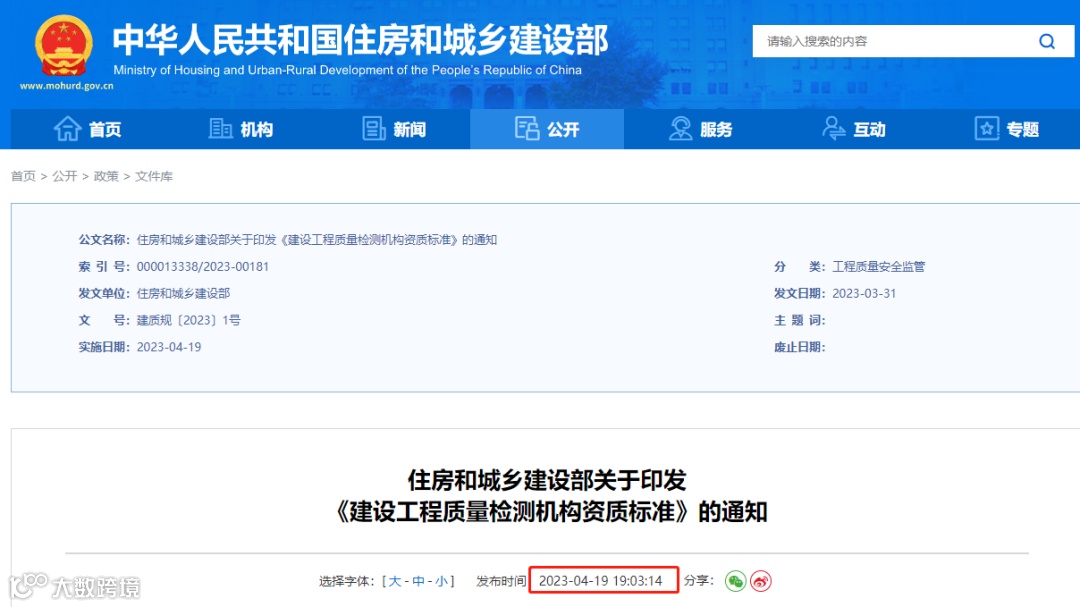 住建部出台《建设工程质量检测管理办法》中华人民共和国住房和城乡建设部令第57号,自2023年3月1日起施行。