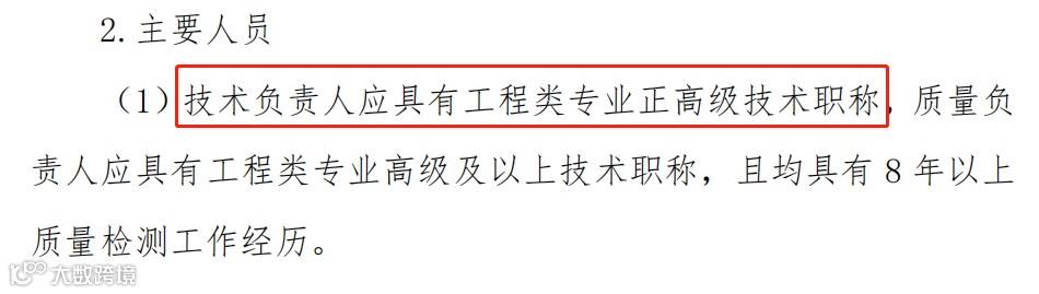 具有工程类专业高级及以上技术职称,具有8年以上质量检测工作经历。 |