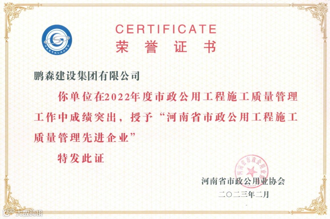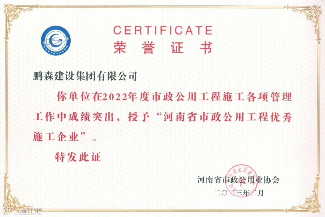 近日,河南省市政公用业协会发布公告,关于表彰2022年“河南省市政公用工程优秀施工企业”等先进单位和先进个人的评审结果公示。在此次评审中,鹏森建设集团有限公司荣获“河南省市政公用工程优秀施工企业”、“河南省市政公用工程施工质量管理先进企业”。常艳涛、王丽霞分别荣获“河南省市政公用工程施工企业优秀项目经理”、“河南省市政公用工程安全管理先进个人”的荣誉称号。