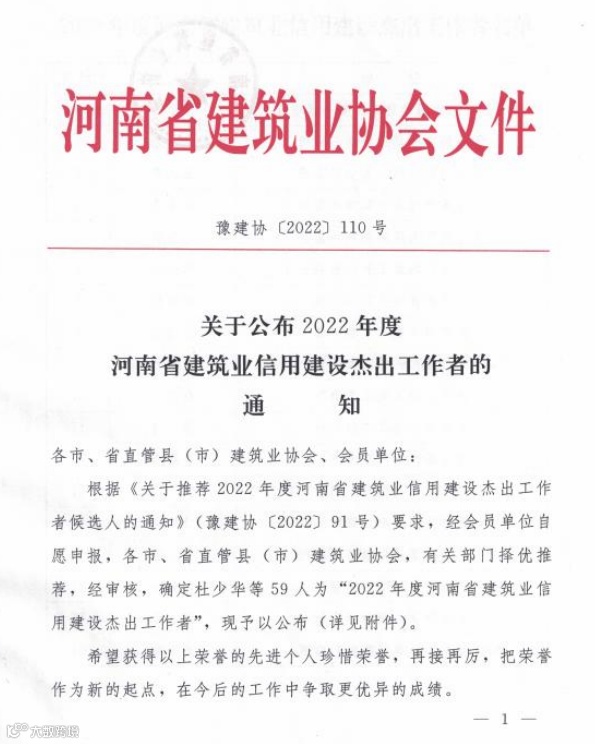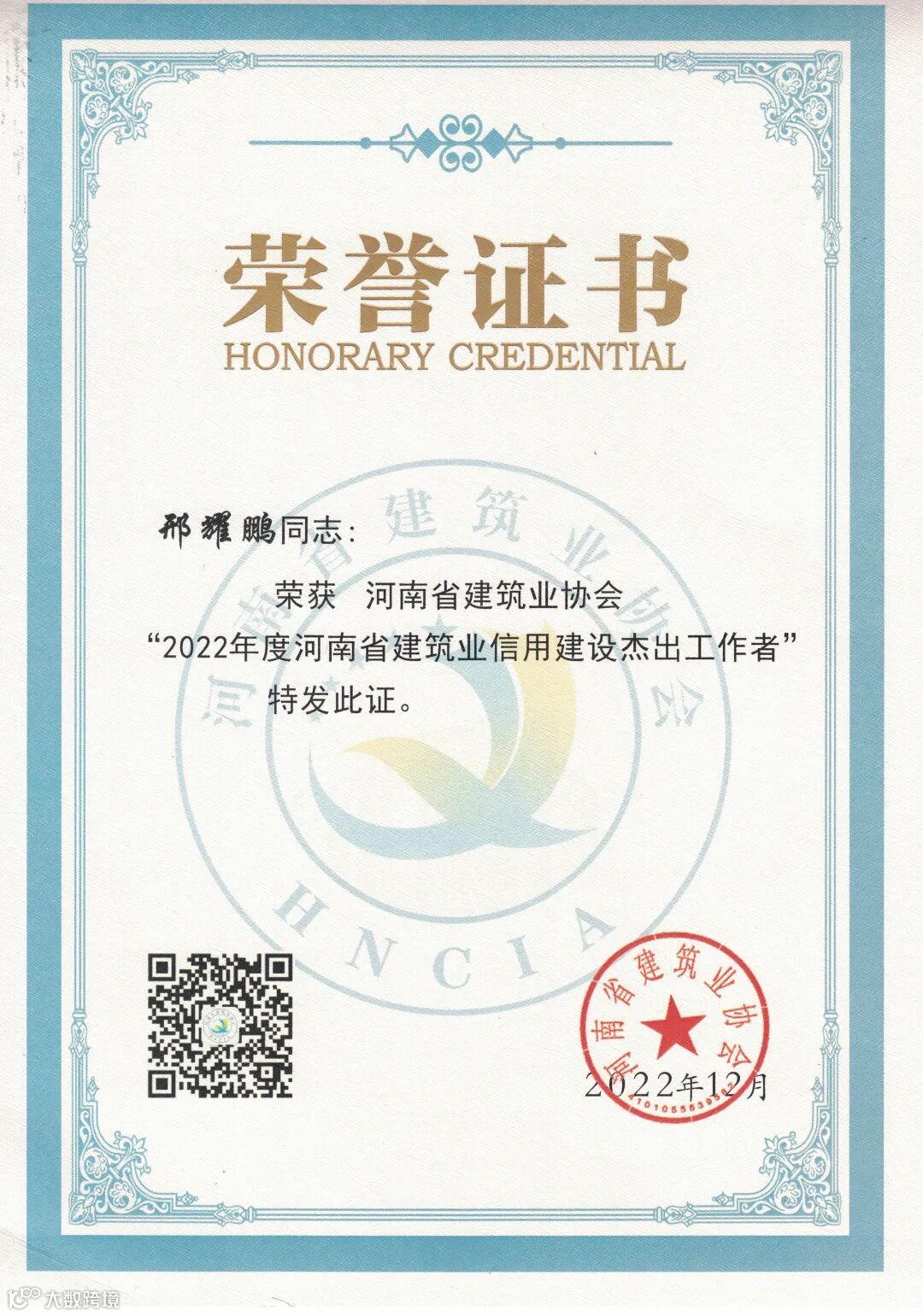 近日,河南省建筑业协会发布公告,关于2022年度河南省建筑业信用建设杰出工作者的评审结果公示。在此次评审中,鹏森建设集团董事长邢耀鹏荣获“2022年度河南省建筑业信用建设杰出工作者”的荣誉称号。