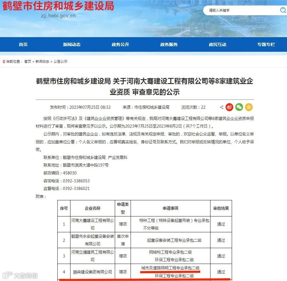 鹏森建设集团有限公司申请的资质增项城市及道路照明工程专业承包贰级、环保工程专业承包贰级,成功获批!