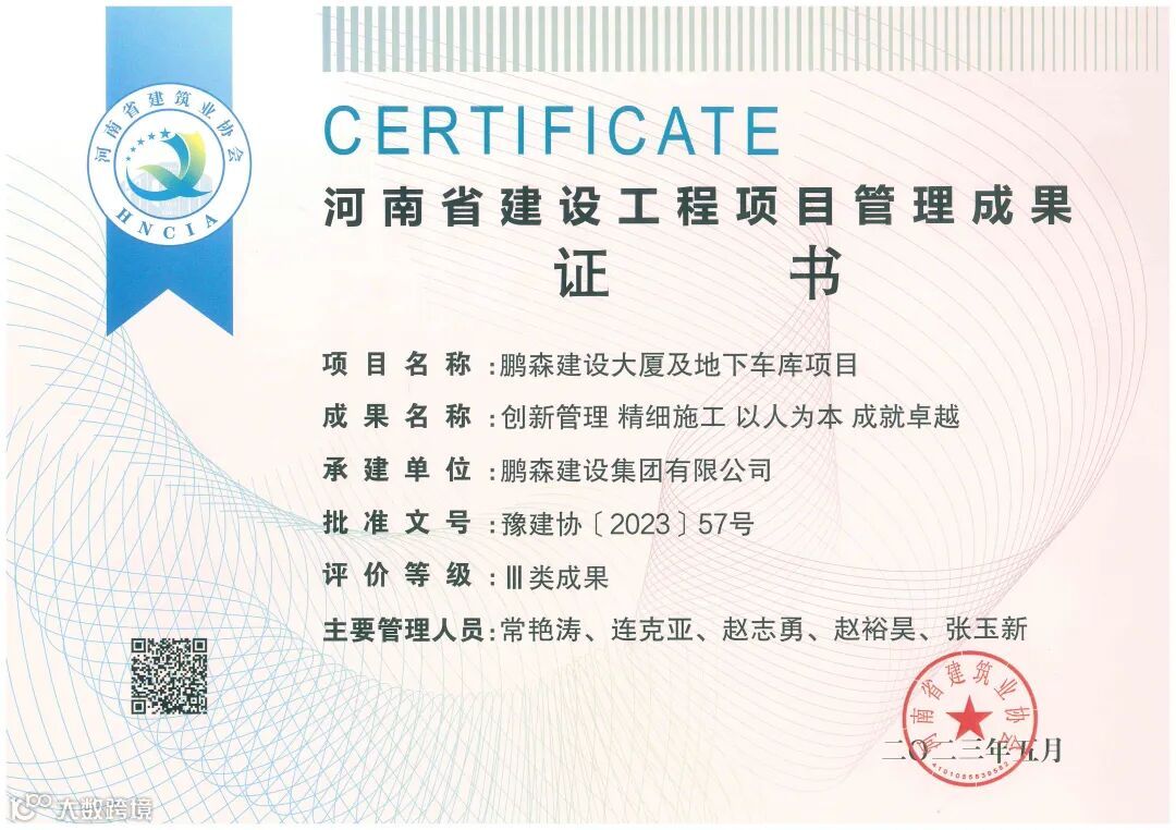 【热烈庆祝】鹏森建设集团有限公司发布的关于鹏森建设大厦及地下车库项目管理成果《创新管理 精细施工 以人为本 成就卓越》,在河南省建筑业协会组织的《关于2023年度河南省建设工程项目管理成果》评审中荣获Ⅲ类成果奖!