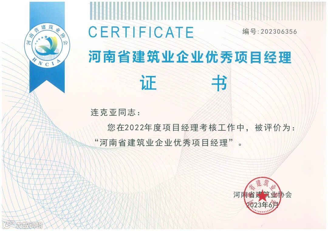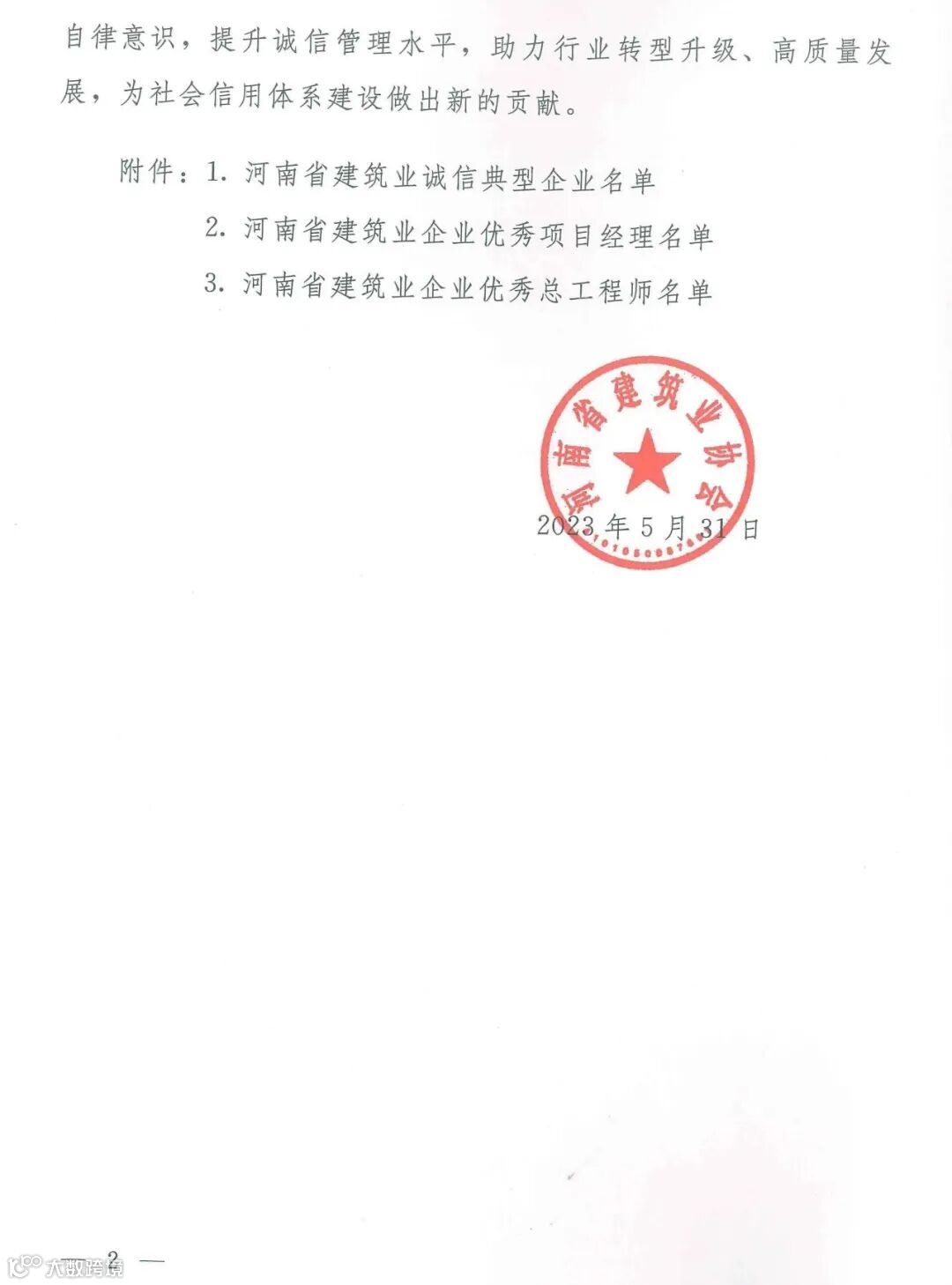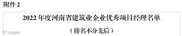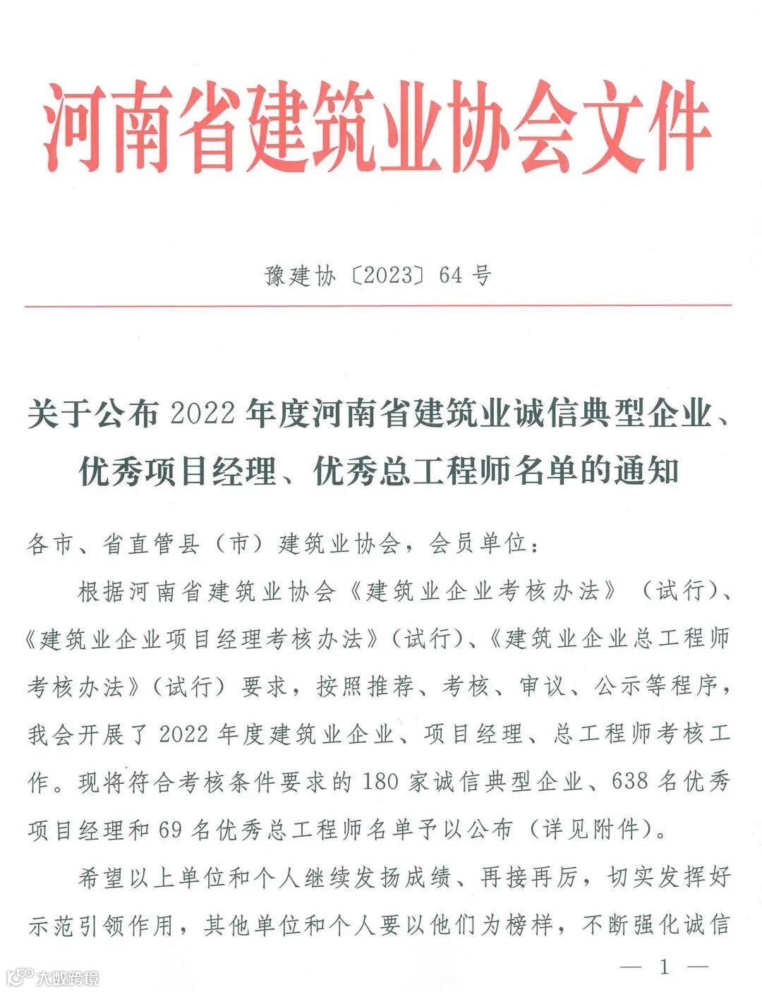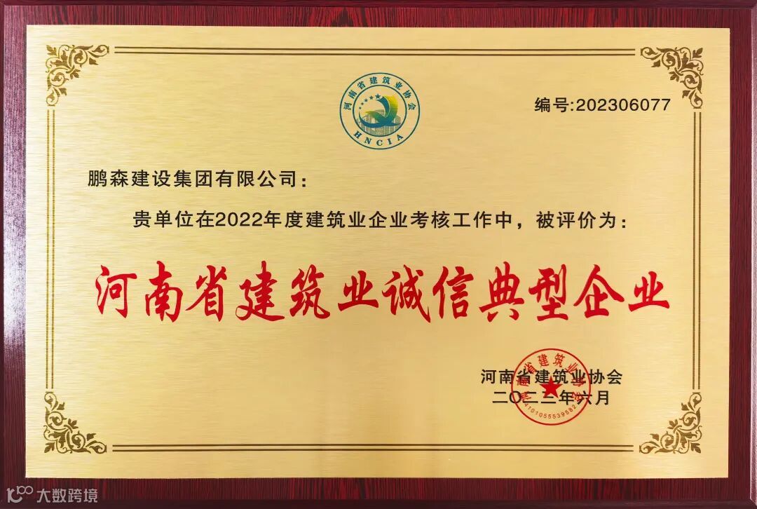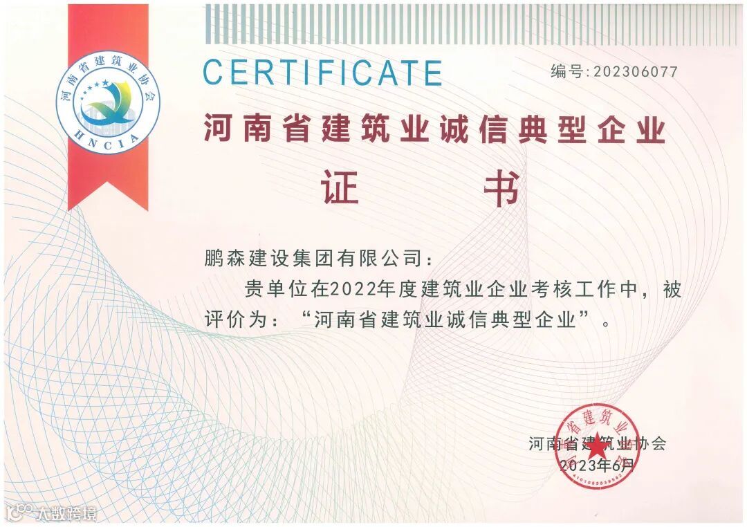 近日,河南省建筑业协会发布红头文件,公布了2022年度河南省建筑业诚信典型企业、优秀项目经理名单。其中,鹏森建设集团有限公司荣获2022年度河南省建筑业诚信典型企业,连克亚、常艳涛荣获优秀项目经理的荣誉称号。
