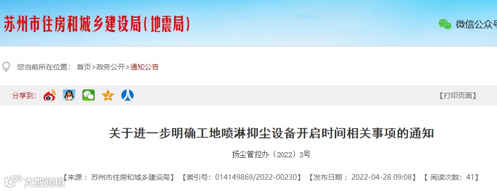 2022年4月,苏州市住建局再发布《关于进一步明确工地喷淋抑尘设备开启时间相关事项的通知》,通知要求: