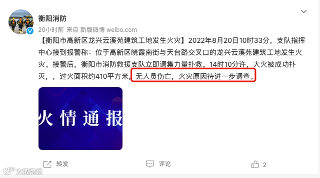 8月20日10时33分,据湖南衡阳消防消息,位于高新区晓霞南街与天台路交叉口的龙兴云溪苑建筑工地发生火灾。接警后,衡阳市消防救援支队立即调集力量扑救。14时10分许,大火被成功扑灭,过火面积约410平方米,无人员伤亡,火灾原因待进一步调查。