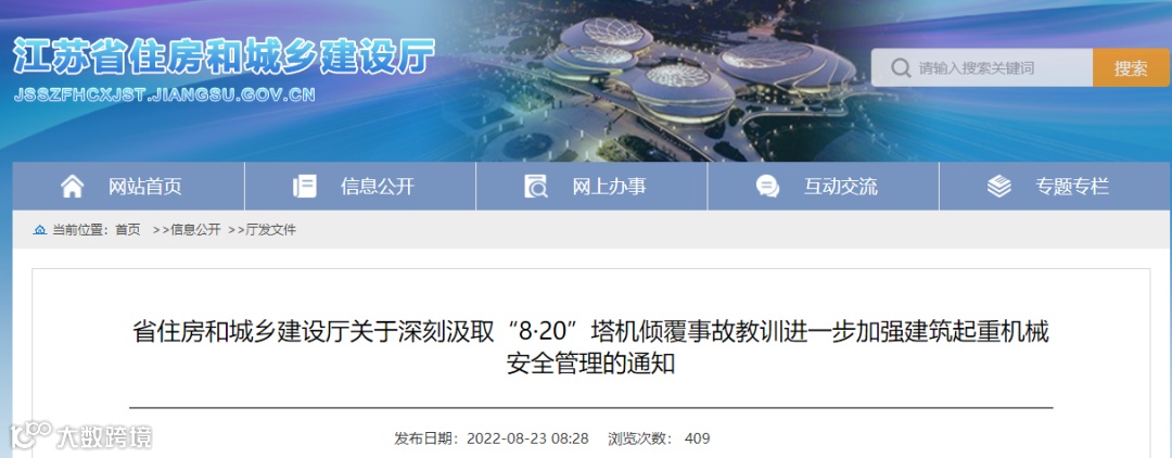 刚刚,江苏省住建厅发布《关于深刻汲取“8·20”塔机倾覆事故教训进一步加强建筑起重机械安全管理的通知》。