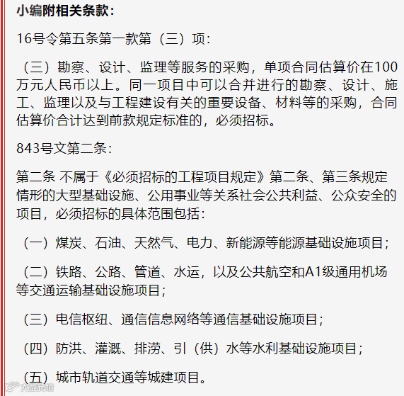 (三)关于招标范围列举事项。依法必须招标的工程建设项目范围和规模标准,应当严格执行《招标投标法》第三条和16号令、843号文规定;法律、行政法规或者国务院对必须进行招标的其他项目范围有规定的,依照其规定。没有法律、行政法规或者国务院规定依据的,对16号令第五条第一款第(三)项中没有明确列举规定的服务事项、843号文第二条中没有明确列举规定的项目,不得强制要求招标。