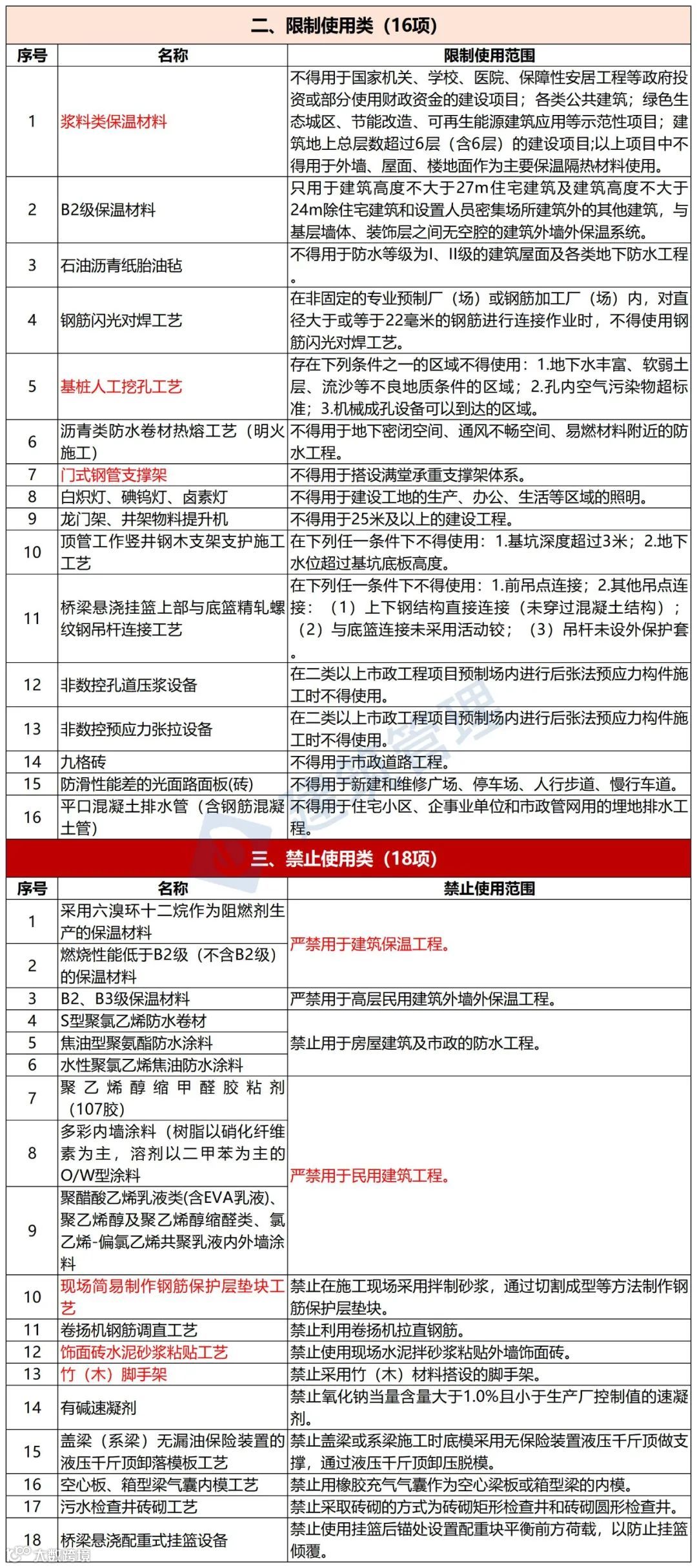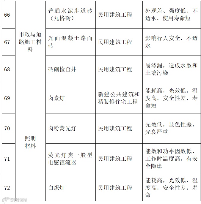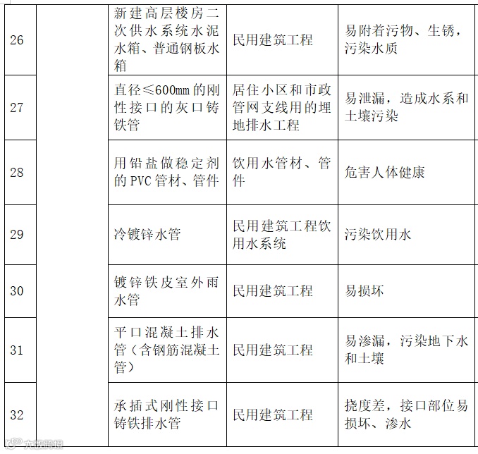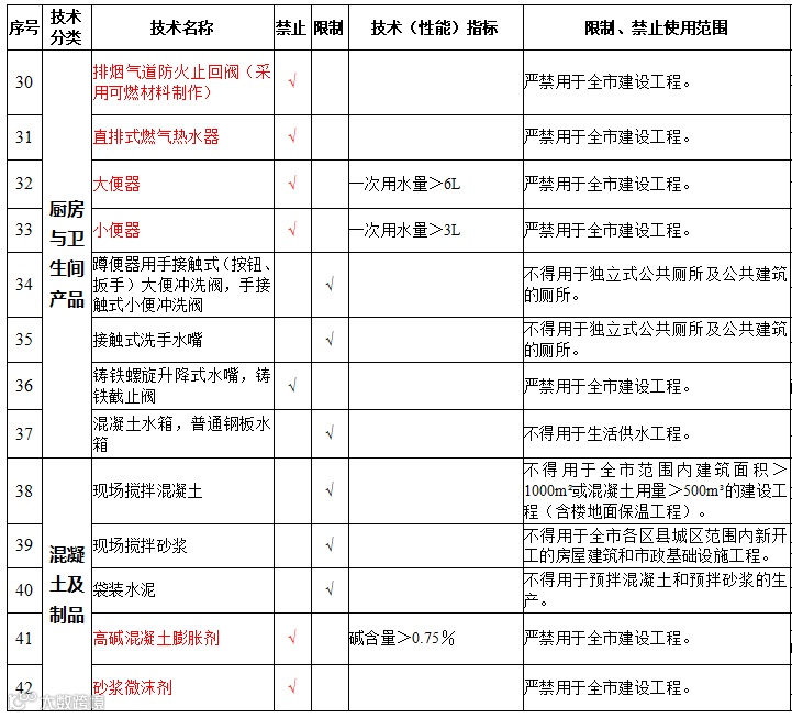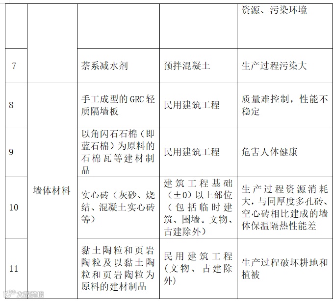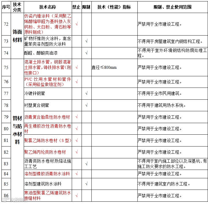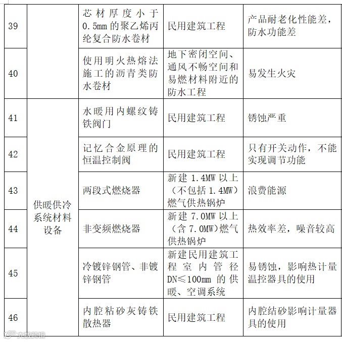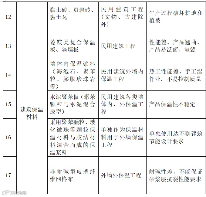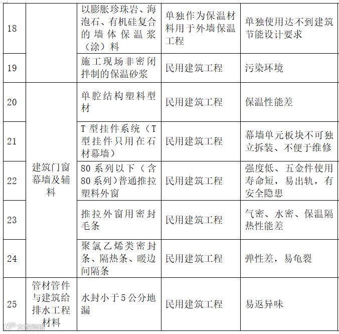 | 19 | 防水材料 | 聚乙烯丙纶防水卷材 | 禁止在新建、改建、扩建的建筑工程中使用 |