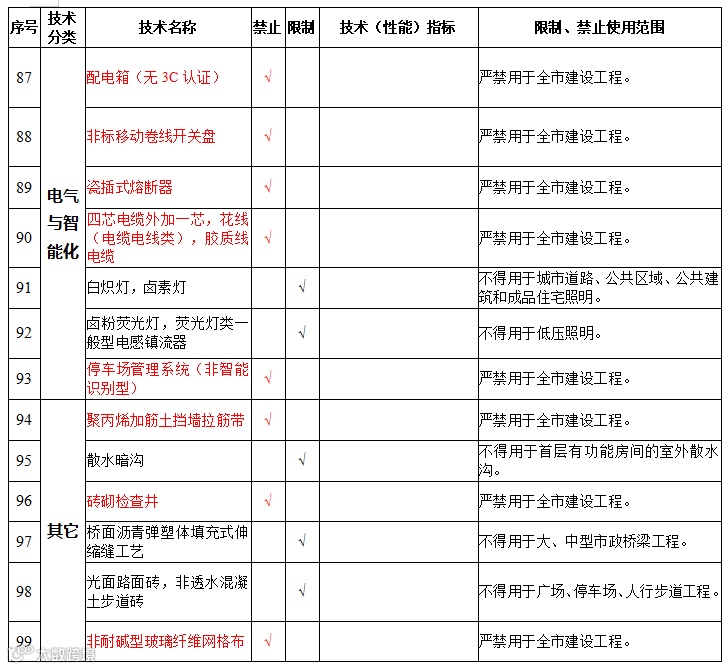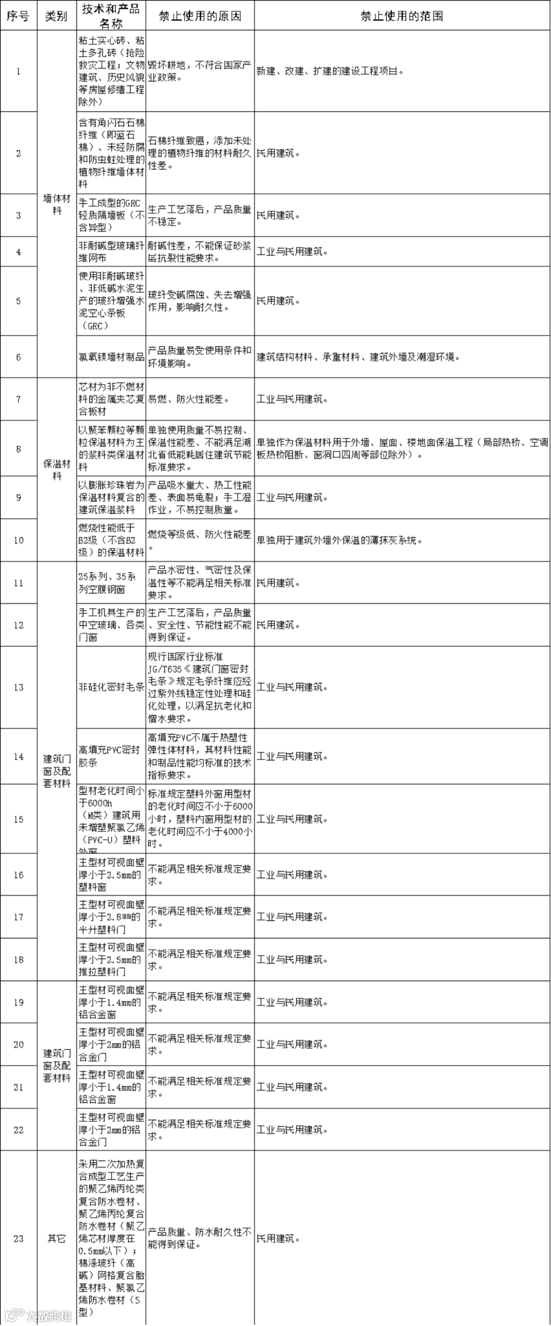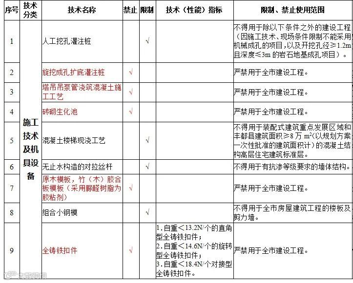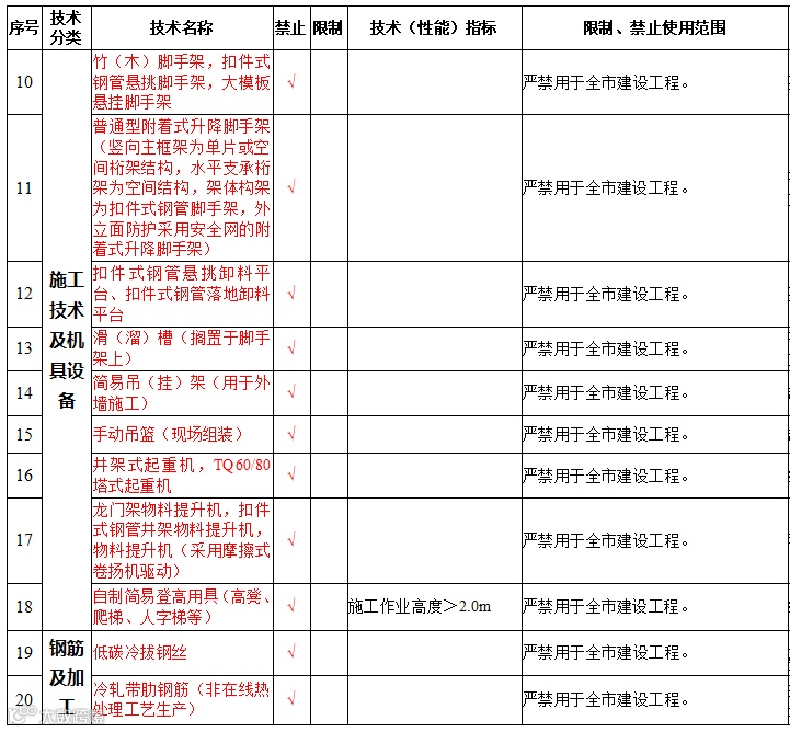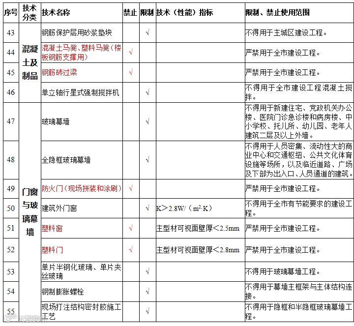 | 18 | 现场加工拼装建筑外窗(大型组装窗和带有转角的凸窗除外) | 禁止在新建、改建、扩建的民用建筑中使用 | |