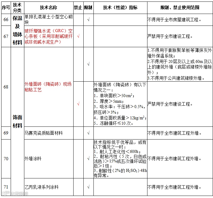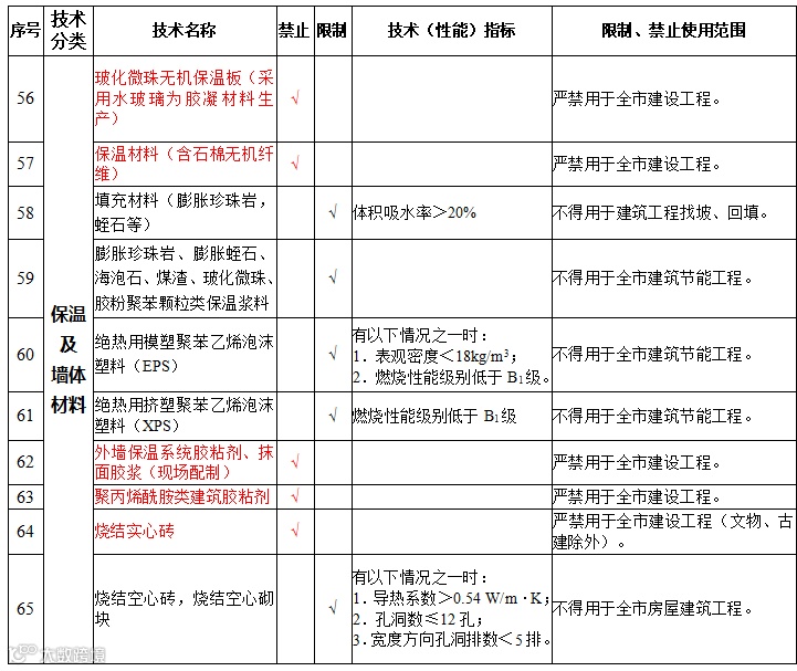 | 1 | 外墙保温系统 | 施工现场采用胶结剂或锚栓以及两种方式组合的施工工艺外墙外保温系统(保温装饰复合板除外) | 禁止在新建、改建、扩建的建筑工程外墙外侧作为主体保温系统设计使用 |
