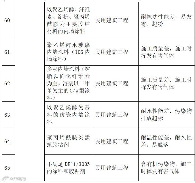 | 21 | 涂料 | 溶剂型涂料 | 禁止在新建、改建、扩建的民用建筑工程中使用 |